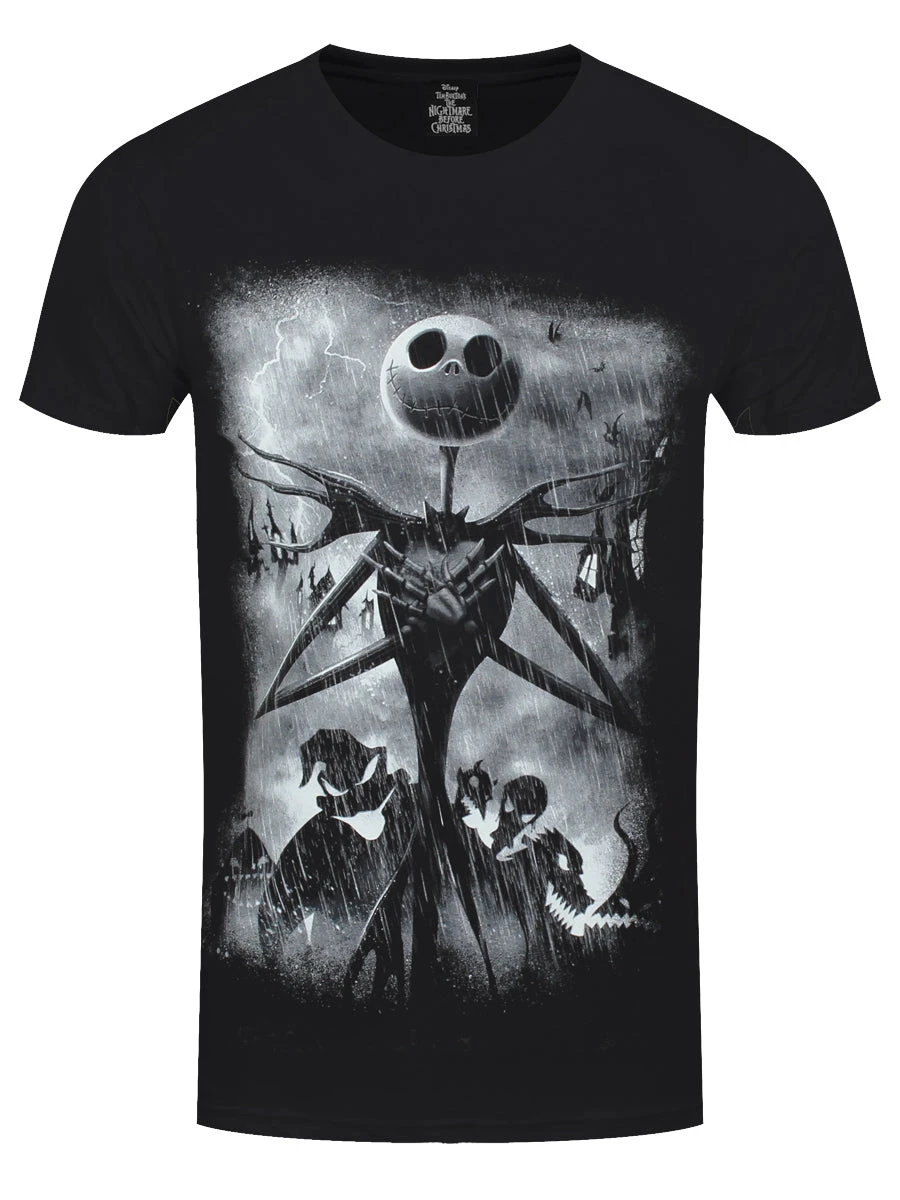 Join the Pumpkin King in Halloween town with this stormy tee! Featuring the infamous Jack Skellington with appearances from Oogie Boogie and other Halloween fiends in the background, this T-shirt adds a gothic sparkle to any outfit. Ho Ho Happy Halloween (town)! Official merch.